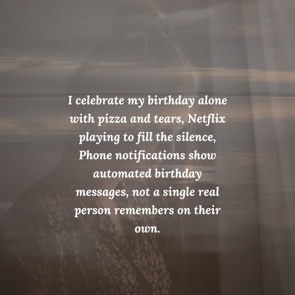 - I celebrate my birthday alone with pizza and tears, Netflix playing to fill the silence, Phone notifications show automated birthday messages, not a single real person remembers on their own.