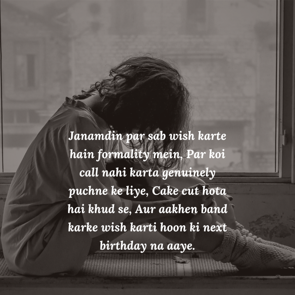 These birthday sad shayari capture the melancholy of growing older without joy, celebrating alone, missing someone who used to make birthdays special, or feeling forgotten.