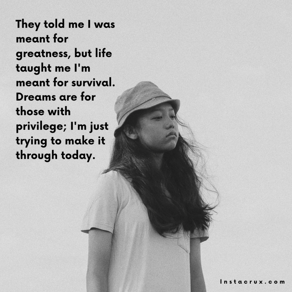 - They told me I was meant for greatness, but life taught me I’m meant for survival. Dreams are for those with privilege; I’m just trying to make it through today.