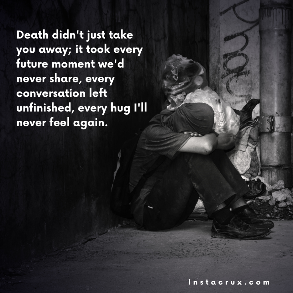 - Death didn’t just take you away; it took every future moment we’d never share, every conversation left unfinished, every hug I’ll never feel again.