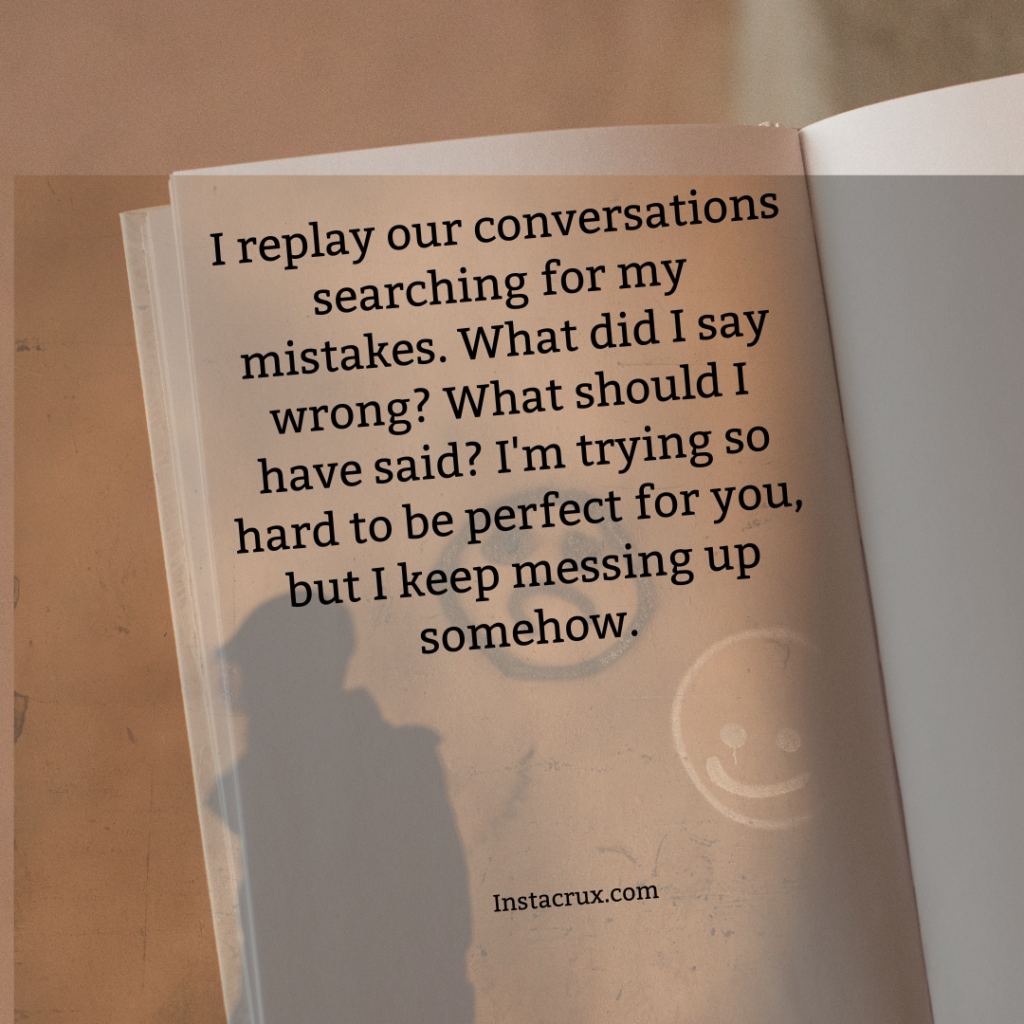 - I replay our conversations searching for my mistakes. What did I say wrong? What should I have said? I’m trying so hard to be perfect for you, but I keep messing up somehow.