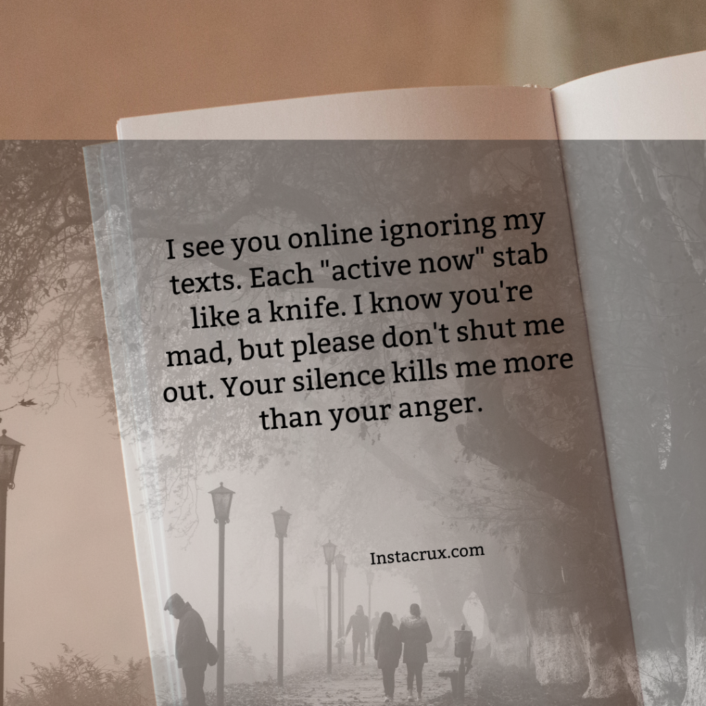- I see you online ignoring my texts. Each “active now” stab like a knife. I know you’re mad, but please don’t shut me out. Your silence kills me more than your anger.